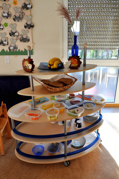 Wir bieten zum Frühstück Mehrkornbrot oder Brötchen an, mit Aufschnitt, Käse oder Quark. Dazu stehen den Kindern immer verschiedene Obst- und Gemüsesorten zur Verfügung. Als Getränk bieten wir Früchtetee, Wasser und Apfelschorle an. Den Kindern stehen immer diese Getränke zur freien Verfügung.